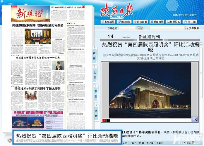 2017年5月2日,《陜西日報(bào)》刊登文章《熱烈祝賀“第四屆陜西照明獎(jiǎng)”評比活動揭曉”》,陜西天和照明設(shè)備工程有限公司喜獲“三大獎(jiǎng)項(xiàng)”,其中,延安大劇院照明工程獲得陜西照明獎(jiǎng)?wù)彰鞴こ淘O(shè)計(jì)最高獎(jiǎng)—&m…