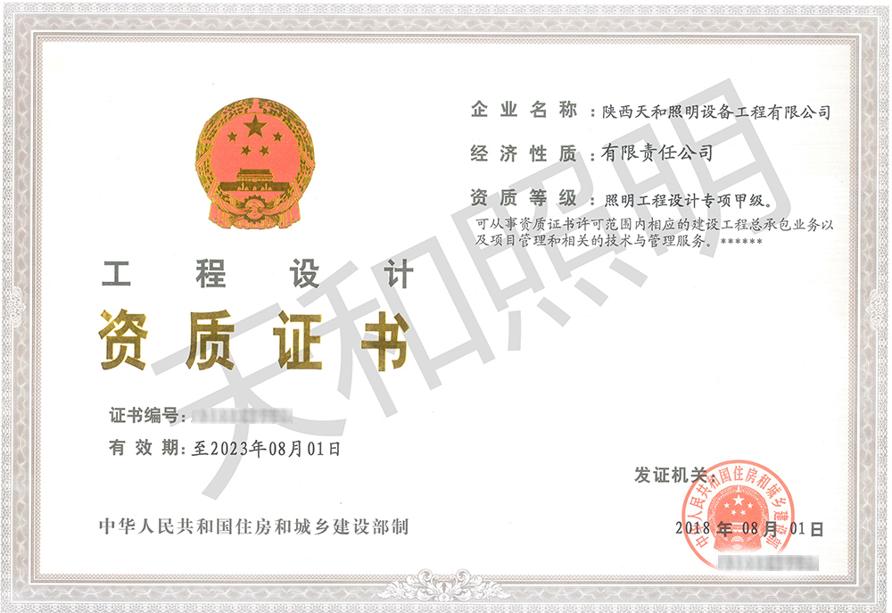 近日,陜西天和照明設備工程有限公司獲得了國家住建部頒發的《照明工程設計專項甲級》資質證書。早在2011年,天和照明已獲取《城市及道路照明工程專業承包一級資質》,至此,公司成功晉級全國照明行業“雙甲”資質企業…